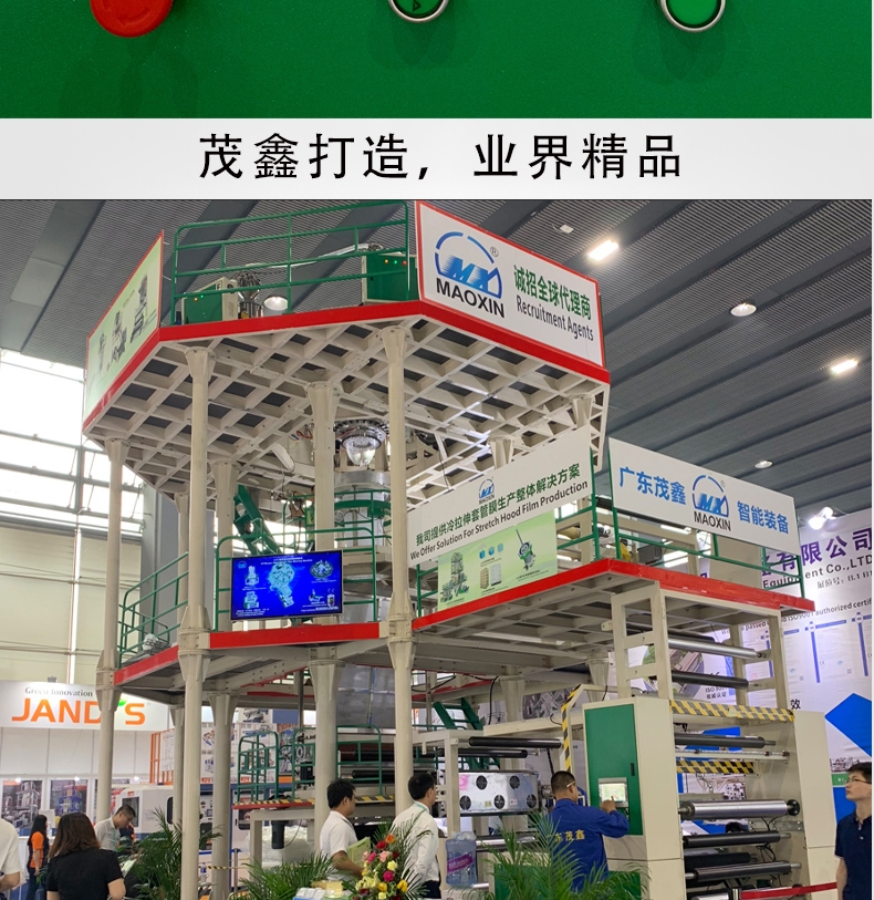 廣東茂鑫的7層共擠下吹水冷高阻隔膜吹膜機組,整機緊湊,低耗,智能,更加貼合